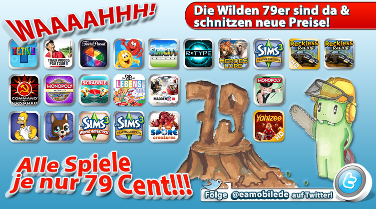 Die Wilden 79er sind los und haben bei EA Games ordentlich an der Preisschraube gedreht. 17 iPhone Apps sowie 5 iPad Apps sind auf 79 Cent reduziert, allerdings nur bis zum 30.11.2010. Aber auch Gameloft lässt sich nicht lumpen und hat seit gestern viele Top Titel ebenfalls auf 79 Cent reduziert. Derzeit kann richtige günstig App geshoppt werden. Lasst euch diese Aktion nicht entgehen.