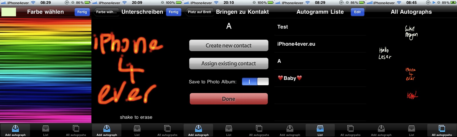 Das iPhone eignet sich dank seines überrangenden Touchscreens mehr als alle anderen Smartphones um kleine Kunstwerke entstehen zu lassen. Dann müsste man doch auch seine eigene Unterschrift zeichenen und speichern können?! Mit der iAutographer App wird genau dies möglich. Farbe wählen und Unterschreiben. Alle Unterschriften können auf dem Blackboard gesammelt oder nach Namen sortiert angesehen und im Fotoalbum gespeichert werden. Leider lässt sich der schwarze Hintergrund nicht ändern. 0,79€ kostet der Autogramm Spass. 3 US Promocodes gehen an euch. Viel Spass damit.