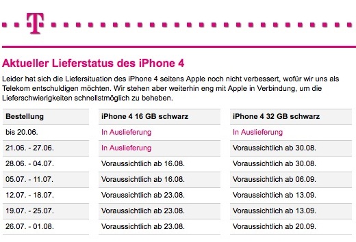 Die Telekom Deutschland informiert aktuell über die Liefersituation bzw. den Lieferengpass in Verbindung mit Apples iPhone 4. So muss man bei vergangenen oder auch aktuellen Bestellungen mit „Pimaldaumen“ 1 Monat Lieferzeit rechnen. Dies gilt allerdings nur für schwarze Geräte und dort die 16GB Ausführung. iPhone 4 in Schwarz mit 32GB lässt ca 2 Monate auf sich warten, nur noch übertroffen vom iPhone 4 in Weiß mit dem Hinweis: Leider gibt es seitens Apple keine neuen Hinweise, wann das iPhone 4 in Weiß geliefert werden kann. Von anderen Providern heißt es das man vor Ende des Jahres nicht mit einem weißen iPhone rechnet.