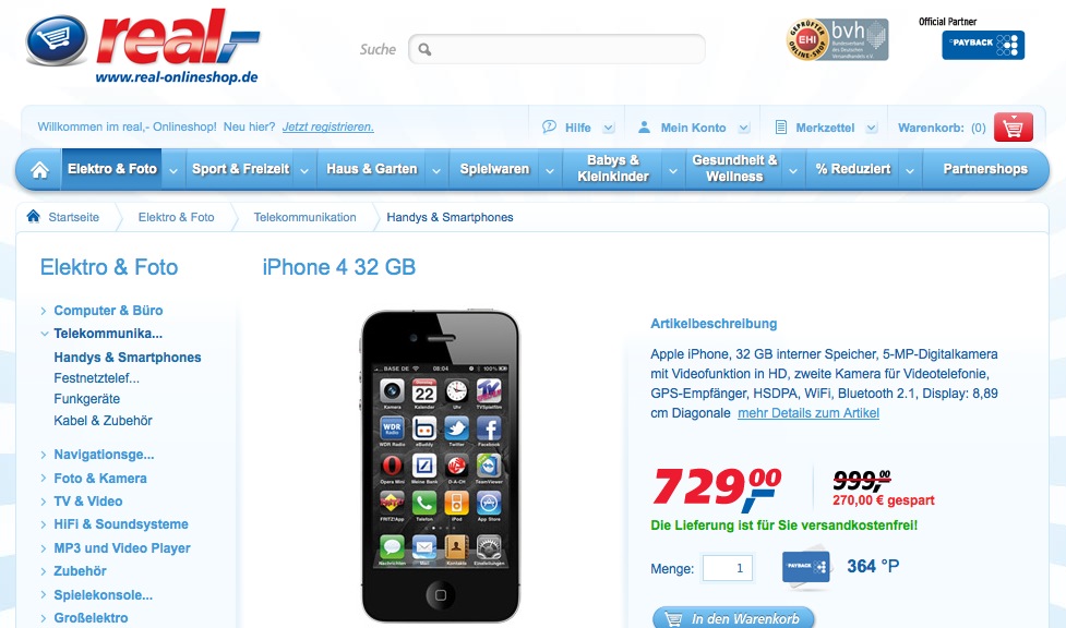 REAL räumt die Lager und Ihr seid die Nutznießer. Denn 10€ günstiger als Apple selbst und ab Lager verfügbar + kostenlosem Versand bietet REAL das iPhone 4 32GB für 729€ ohne Vertrag / SIM/ Netlock an. Wer einen Gutscheincode zur Hand hat kommt sogar noch günstiger davon. Also bitte zuschlagen. Hier gehts zum iPhone 4 bei REAL.