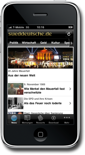 Ein weites Nachrichten Magazin wagt den Sprung auf die iPhone Plattform. Die Sueddeutsche bietet derzeit eine Basic sowie eine Premium Variante Ihrer App an. Die Basic Variante verzichtet auf Pushbenachrichtigungen und kommt mit einer 8 Sekündigen Einblendung beim starten der App daher. Der Inhalt ist in beiden Varianten gleich.