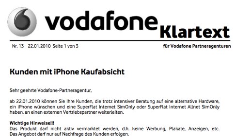 In einem aktuellen Schreiben an Partneragenturen bestätigt Vodafone das „hartnäckige“ Kunden doch ein iPhone erhalten können. Vodafone verweist bei einer Bestellung an 3 verschiedene Shops: telcoland.denext-click.de und handyfuchs.de. via